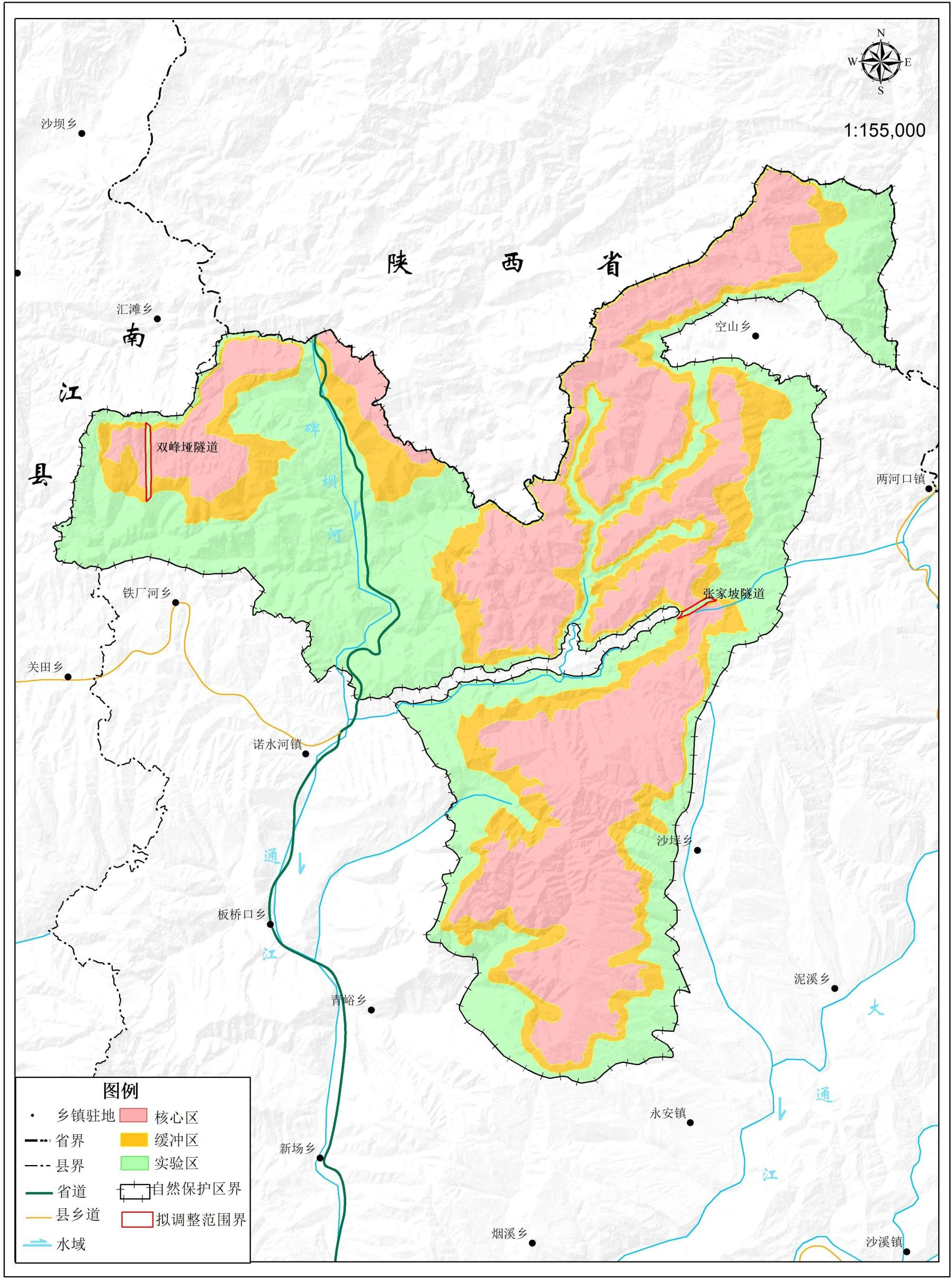 四川诺水河省级自然保护区功能区调整后,保护区总面积57043公顷,核心区面积21745.62公顷,缓冲区面积10867.90公顷,实验区面积24429.48公顷。保护区范围及功能区见附图。