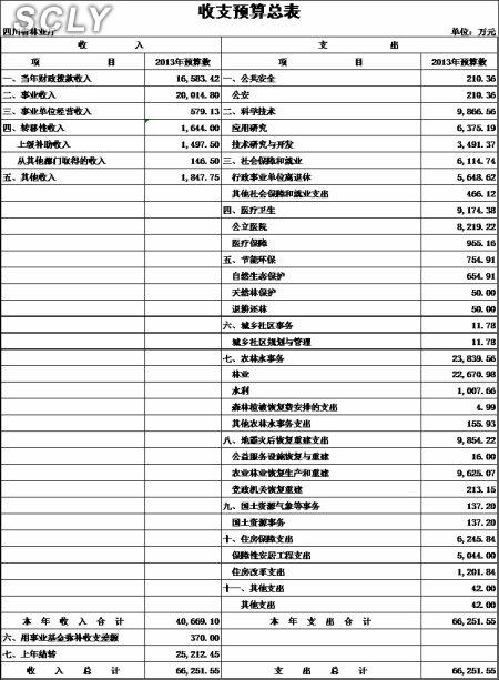 2013年省林业厅收入预算总额为66251.55万元,其中:当年财政拨款收入16583.42万元,事业收入20014.80万元,事业单位经营收入579.13万元,上级补助收入1497.50万元,从其他部门取得的收入146.50万元,其他收入1847.75万元,用事业基金弥补收支差额370万元,上年结转收入25212.45万元。相应安排支出预算66251.55万元,其中:公共安全支出210.36万元,科学技术支出9866.56万元,社会保障和就业支出6114.74万元,医疗卫生支出9174.38万元,节能环保支出754.91万元,城乡社区事务支出11.78万元,农林水事务支出23839.56万元,地震灾后恢复重建支出9854.22万元,国土资源气象等事务支出137.20万元,住房保障支出6245.84万元,其他支出42万元。