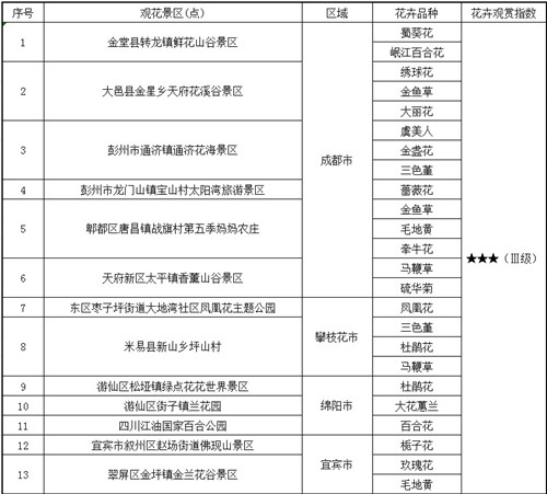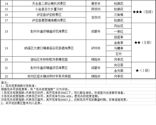 本期推荐:成都市金堂县转龙镇鲜花山谷景区的蜀葵花和岷江百合花、大邑县金星乡天府花溪谷景区的绣球花、彭州市通济镇通济花海景区的虞美人、彭州市龙门山镇宝山村太阳湾旅游景区的蔷薇花、郫都区唐昌镇战旗村第五季妈妈农庄的毛地黄、天府新区太平镇香薰山谷景区的马鞭草、攀枝花市东区枣子坪街道大地湾社区凤凰花主题公园的凤凰花、绵阳市游仙区街子镇兰花园的大花蕙兰、宜宾市叙州区赵场街道佛现山景区的栀子花、雅安市天全县二郎山喇叭河景区的杜鹃花、阿坝州小金县日尔乡董马村的杜鹃花、甘孜州泸定县磨西镇海螺沟景区的杜鹃花,周末将至,相约亲朋好友,一起去赏花!